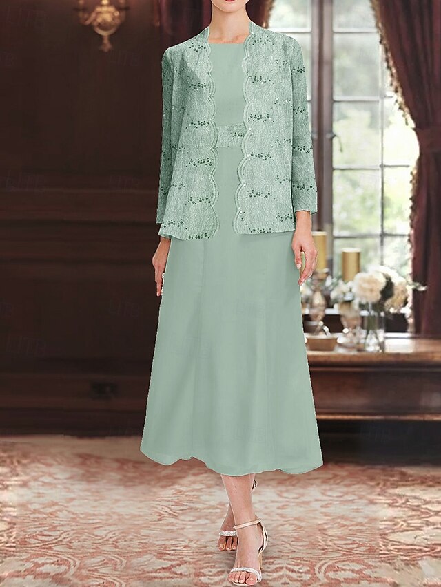 Why Choose Sequin Lace Two Piece A-Line Mother of the Bride Dress Elegant elementary Luxurious Chiffon Boat Neck Midi Length Sleeveless with Long Sleeve Jacket?