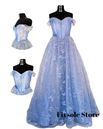 • ʚɞFeatures: Fivsole Women's 3D Butterfly Applique Prom Dress for Women Off Shoulder Corset Fairy Princess Ball Gowns Empire High Waist Long Tulle A-Line Sleeveless Formal Evening Party Gowns for Teens Breathable, Built-in bra, Adjustable Lace-Up Back.