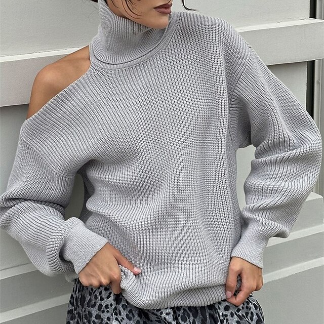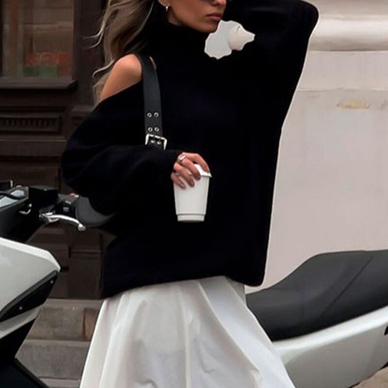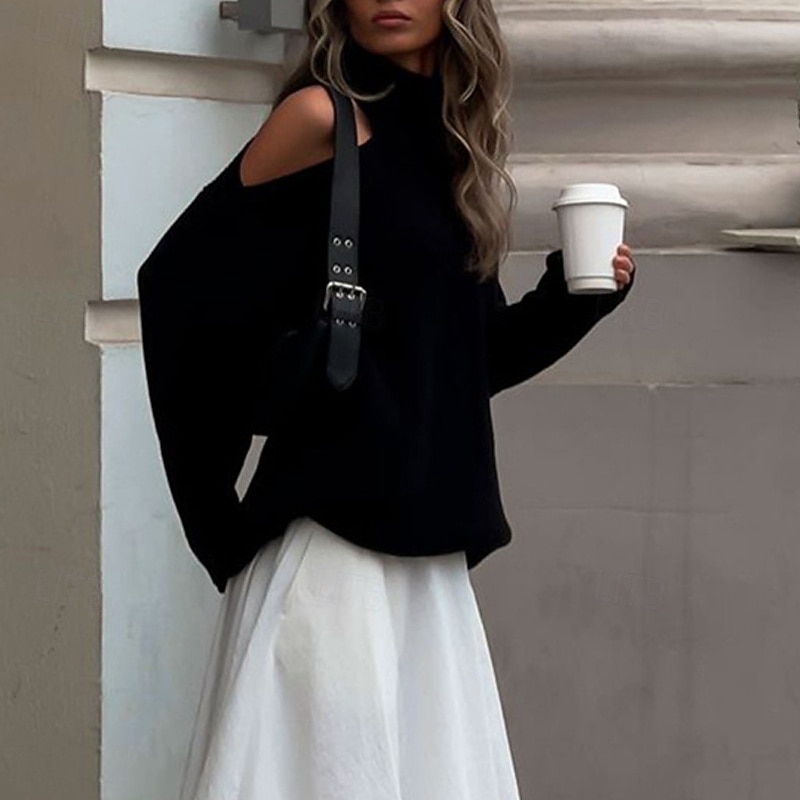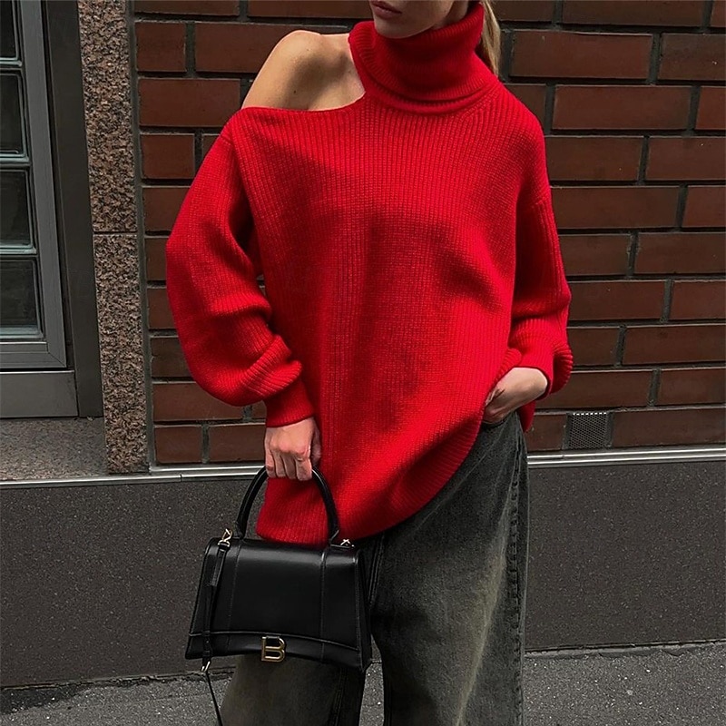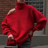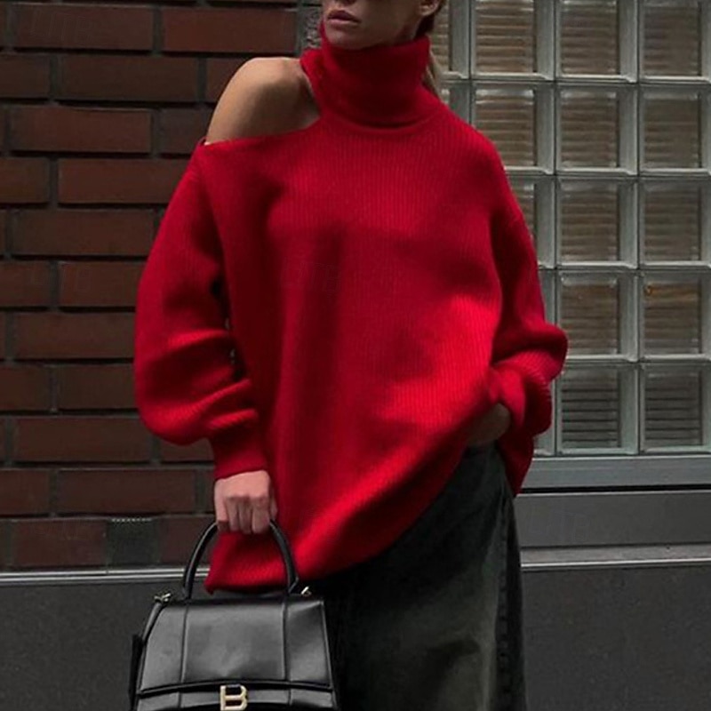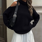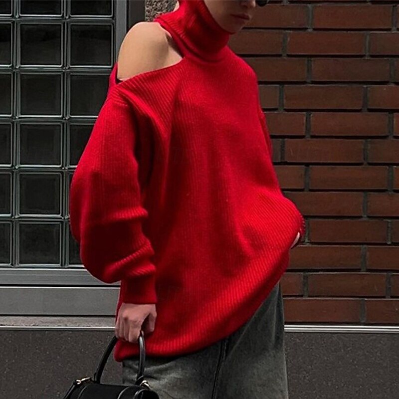 More information about Women's Sweater Pullover Fashion Streetwear Casual Pure Color Ribbed Turtleneck Knitted Cold Shoulder Long Sleeve Regular Tops Knit Outdoor Daily Weekend Black Red Fall Winter