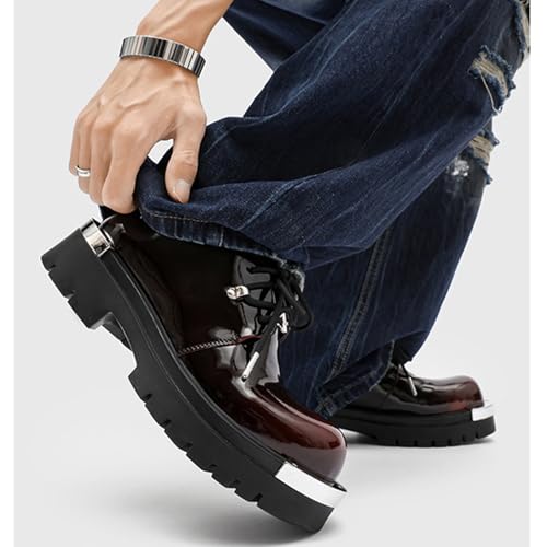 HOT ! Men's Patent Leather Gradient Metal-Plate Platform Oxfords Classic Round Toe Lace Up Chunky Heel Anti-Slip Lug Sole Heighten Derby Shoes