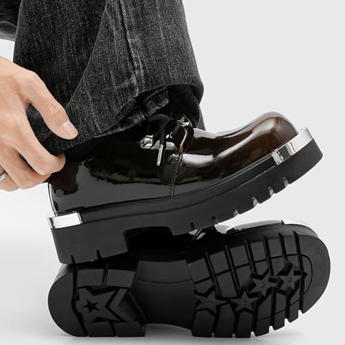 Men's Patent Leather Gradient Metal-Plate Platform Oxfords Classic Round Toe Lace Up Chunky Heel Anti-Slip Lug Sole Heighten Derby Shoes 6
