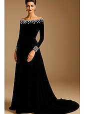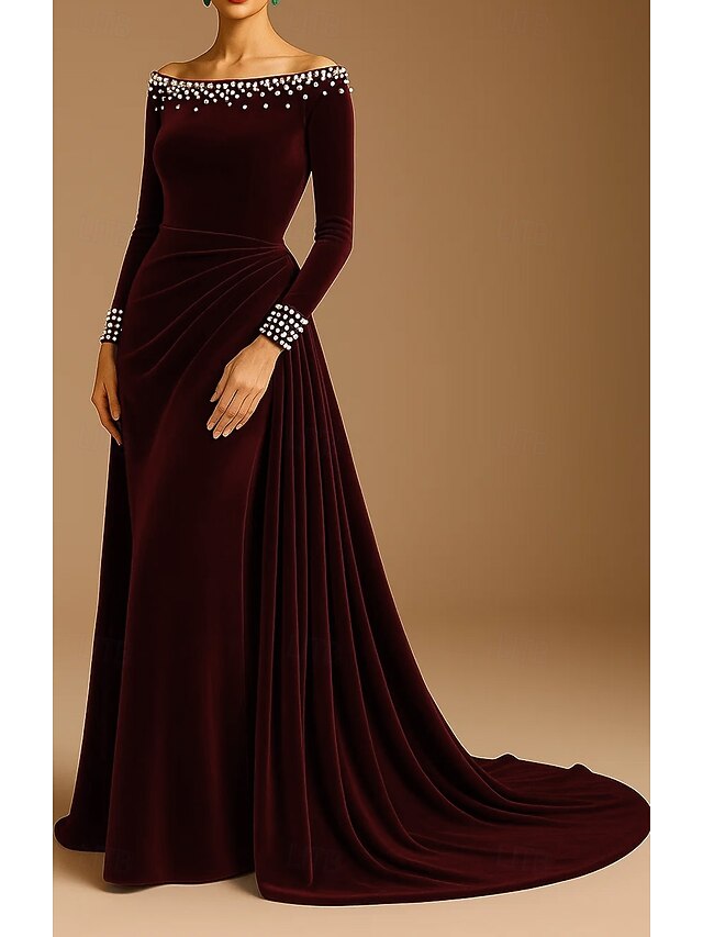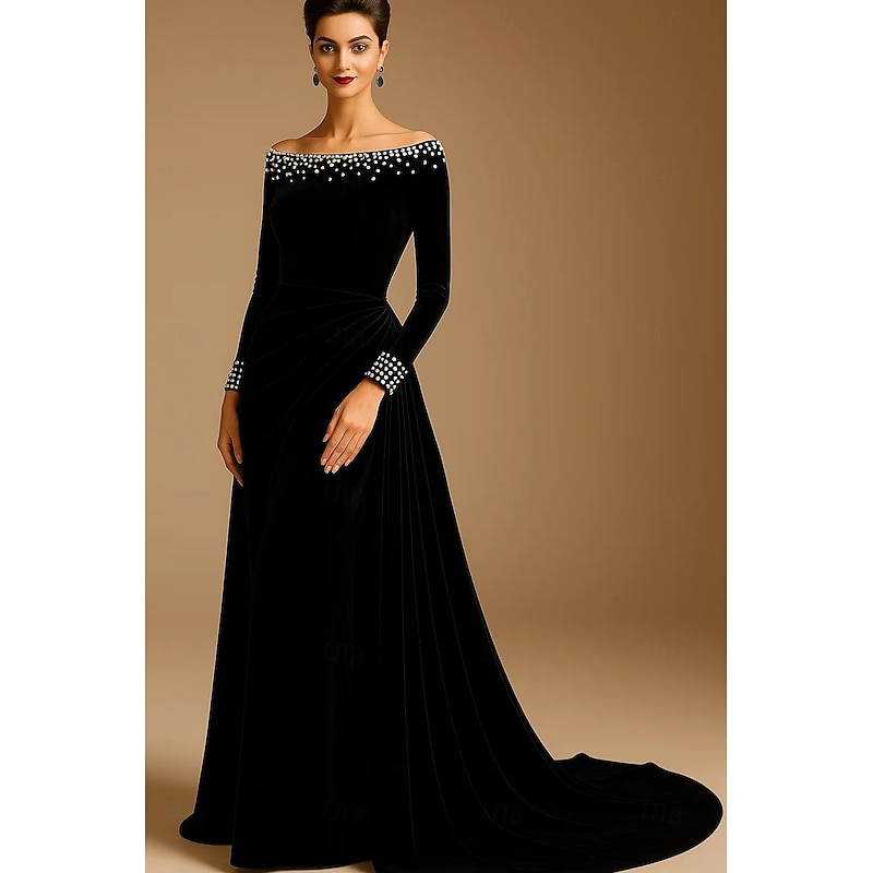 More information about Black Tie Velvet A-Line Sheath / Column Evening Gown Elegant Formal Dress Formal Wedding Sweep / Brush Train Long Sleeve Pearls Off Shoulder with Pleats Ruched 2025