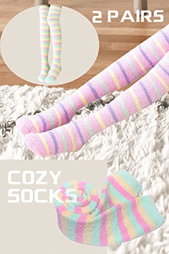 CutiePlusU Striped Coral Fleece Winter Warm Over Knee High Socks - Soft Fuzzy Thigh High 2 Pairs Pack 2