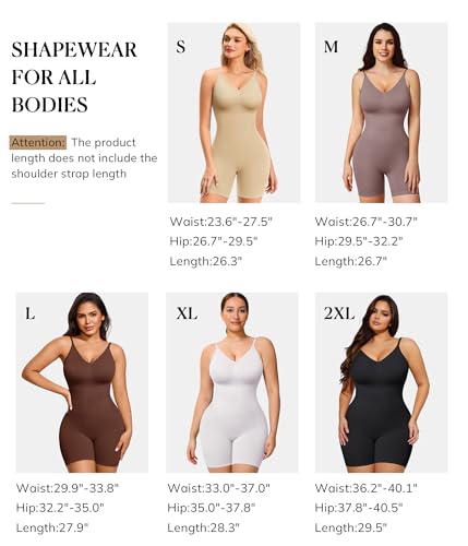 • Full Body Shapewear For Women. Our womens bodysuits is designed low back and full body style with targeted compression zones to slim your waist and push up breast and lift up hips, thighs, hiding any bumps or bulges and shaping your waistline for a flattering silhouette. The full body shaper for women is crotch closure style and shorts design, which can also be worn as a fashionable and functional outer garment,suitable for various occasions.