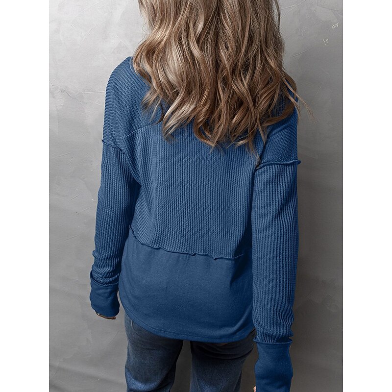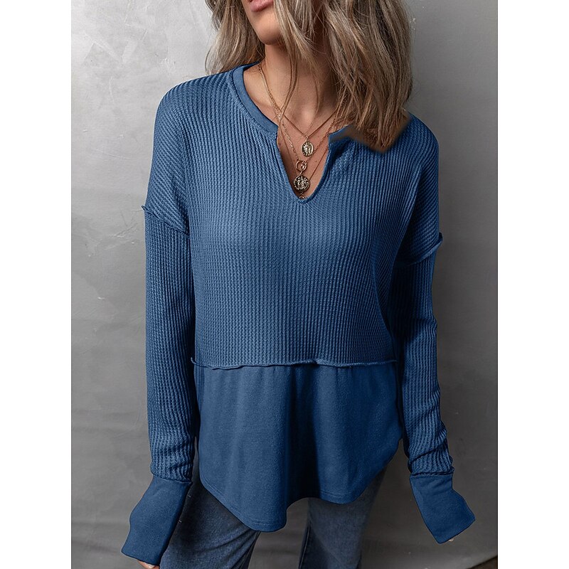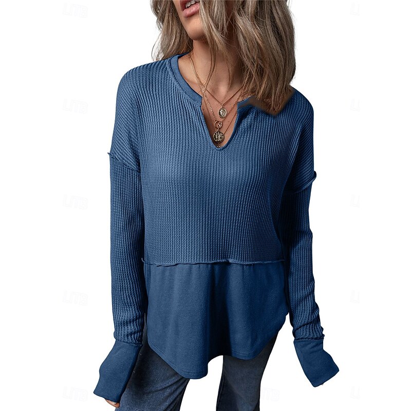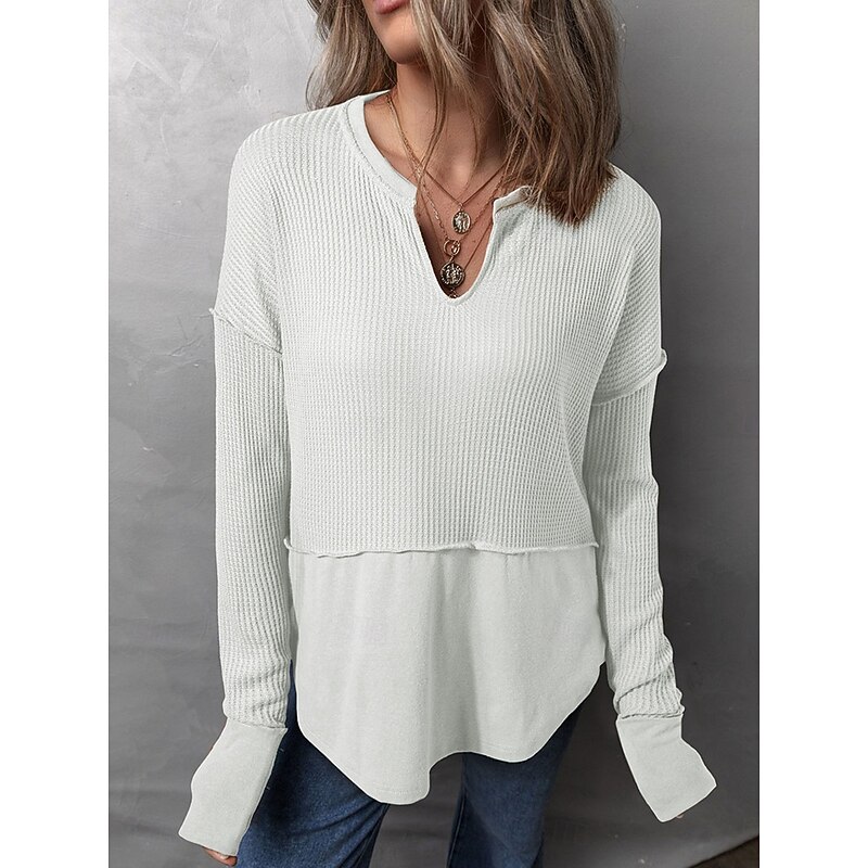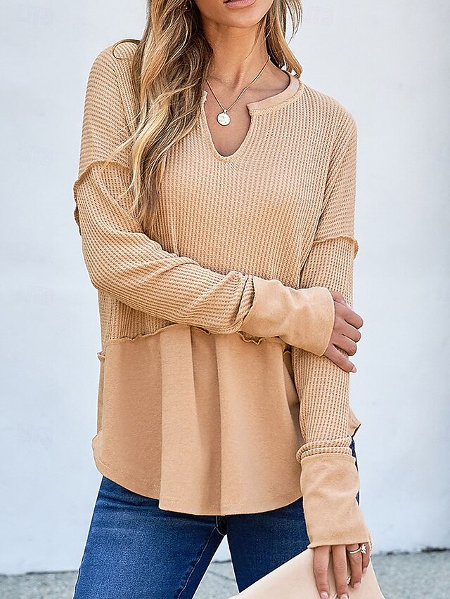 Highlights [Fabric] This women's sweatshirt is crafted from a cozy polyester blend, providing a perfect balance of warmth and breathability. The waffle-knit texture adds a stylish element to the fabric, enhancing its appeal for the fall and winter seasons. [Fit] Featuring a regular fit, this top offers a relaxed and comfortable silhouette. The micro-elastic quality of the fabric ensures ease of movement and versatility in styling. [Design Highlights] The sweatshirt boasts a subtle V-neckline that adds a touch of elegance to its casual style. Its muted beige color provides a versatile and chic look, perfect for pairing with jeans or layering under jackets. [Occasions] Ideal for daily wear and street style, this sweatshirt is suitable for a variety of casual occasions. Whether you're going for a laid-back weekend outing or running errands, it offers both comfort and style. [Size Range] Available in sizes S, M, L, XL, and 2XL, this sweatshirt caters to a wide range of body types, ensuring a perfect fit for everyone.