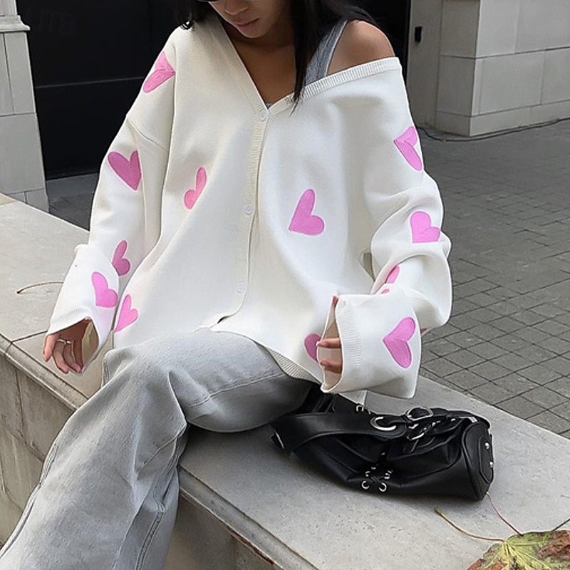 Women's Sweater Cardigan Fashion Streetwear Daily Heart Ribbed V Neck Knitted Long Sleeve Regular Tops Knit Holiday Going out Weekend Pink Fall Winter 2