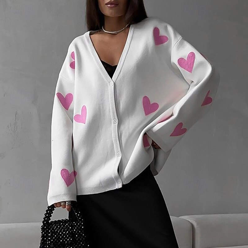 Highlights - Stay cozy and stylish in this Fall and Winter cardigan sweater - Made from polyester for a comfortable wear - Features long sleeves to keep you warm - Designed for women with a regular fit - Adorned with a charming heart pattern - V-neckline adds a touch of elegance - Knit in a ribbed style for added texture and detail