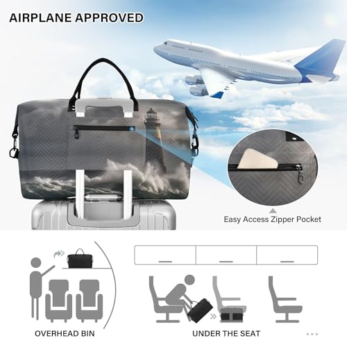 Large Travel Duffel Bag, Lighthouse Waves Dark Sport Tote Gym Bag, Shoulder Weekender Overnight Bag for Women Men, Carry On Luggage with Toiletry Bag 7
