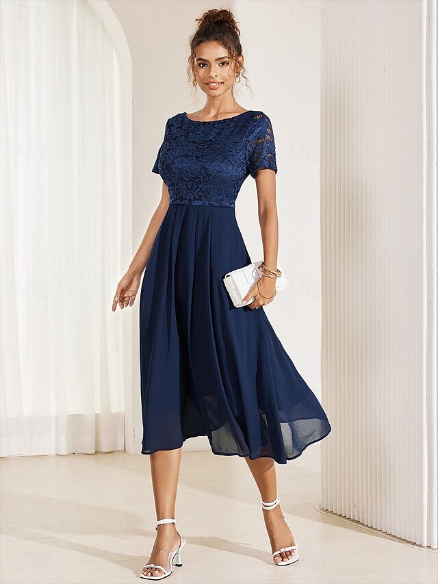 HOT ! Women's Wedding Guest Cocktail Dress Chiffon Contrast Lace Ruffle Hem Elegant Formal Midi A Line Dress Crew Neck Short Sleeve Dark Blue Color