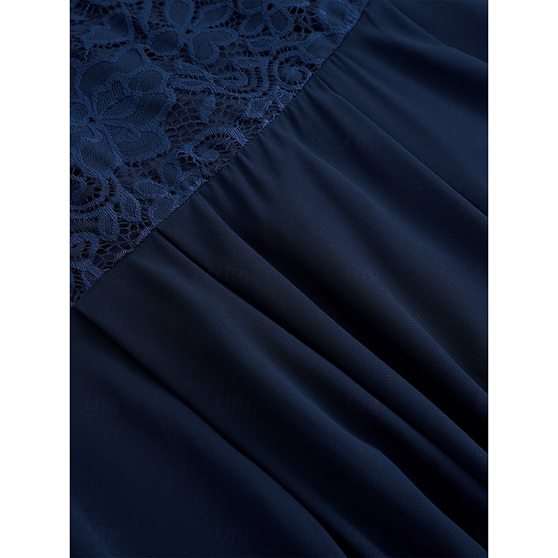 Women's Wedding Guest Cocktail Dress Chiffon Contrast Lace Ruffle Hem Elegant Formal  Midi A Line Dress Crew Neck Short Sleeve Dark Blue Color 9