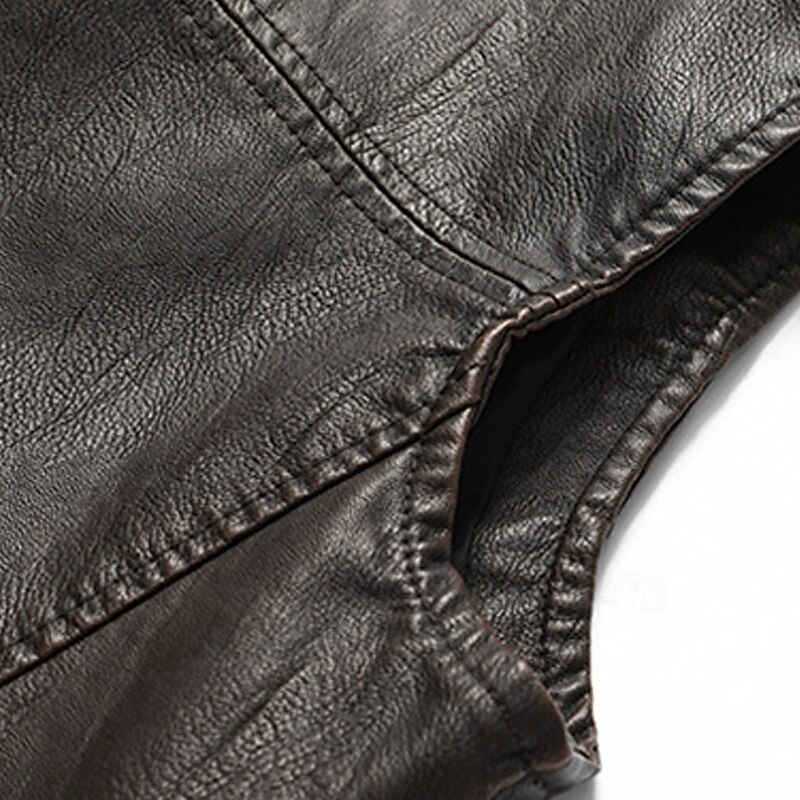 Highlights [Fabric] : Crafted from high-quality PU leather, this men's vest offers a sleek and durable exterior. The fabric is designed for a thermal, warm experience, making it an excellent choice for the fall and winter seasons. The vest features a soft fleece lining to provide extra insulation and comfort during cooler weather. [Fit] : This vest is tailored in a regular fit that flatters the male silhouette while allowing for easy layering over other garments. The cut is designed to balance style and functionality, ensuring you look sharp while staying comfortable. [Design Highlights] : The vest boasts a modern and practical design with a zipper placket for easy wear. The stand collar adds a touch of sophistication while providing additional coverage against the cold. Functional pockets offer convenience, and the plain pattern keeps the look versatile and easy to pair with different outfits. [Occasions] : Perfect for a wide range of occasions, this versatile vest can be worn at weddings, daily outings, events, and parties. It easily transitions from casual to more formal settings, making it an essential piece for any stylish man's wardrobe. [Size Range] : Available in sizes M, L, XL, 2XL, 3XL, 4XL, and 5XL, this vest caters to a variety of body types, ensuring the perfect fit for every man seeking both style and warmth.