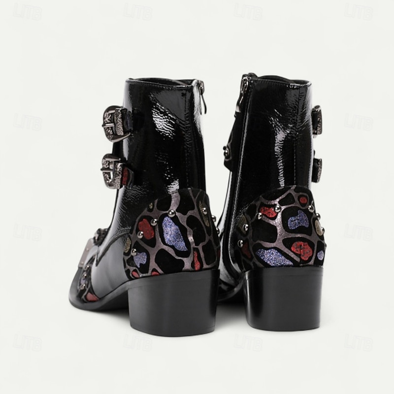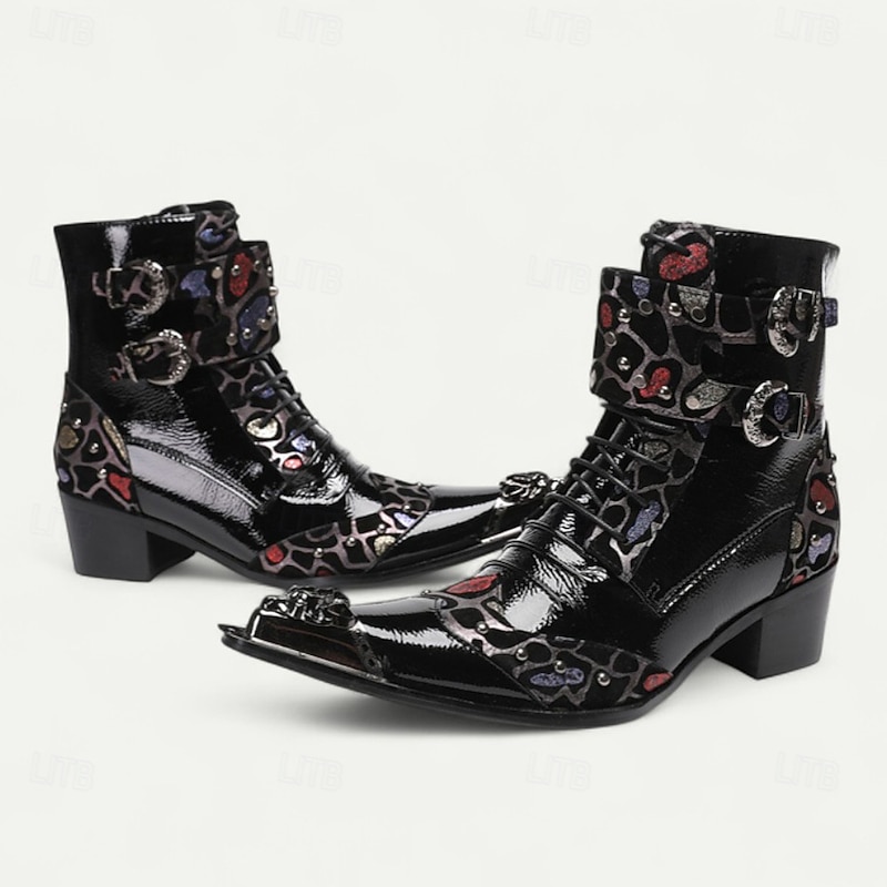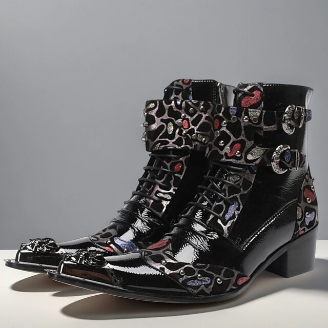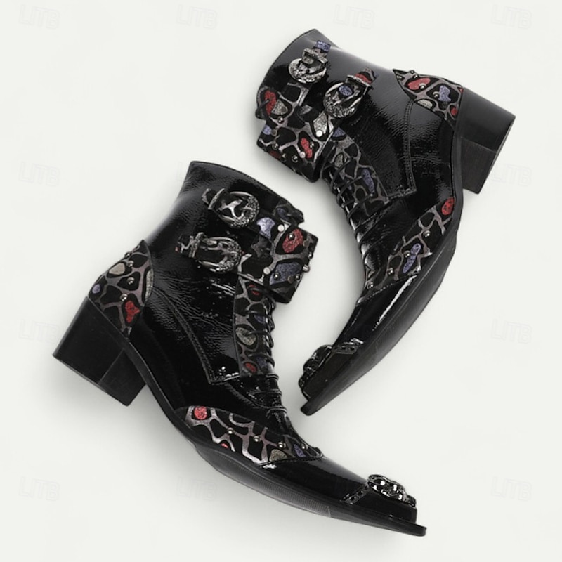 trending ! Men's Black Patent Leather Buckle Ankle Boots with Floral Pattern – Rock Gothic Style Party & Nightlife Fashion Shoes