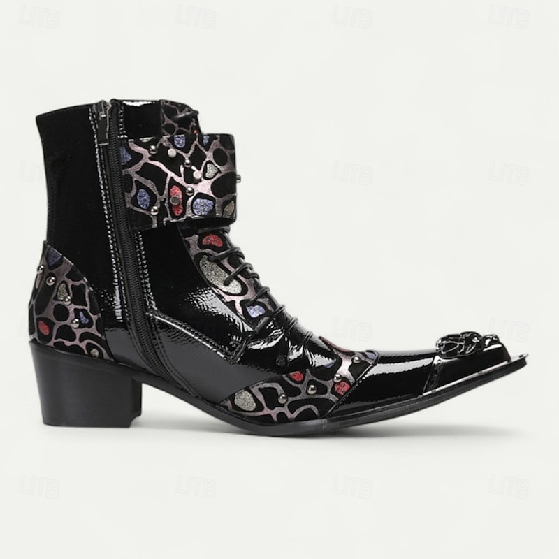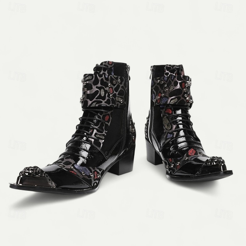 More information about Men's Black Patent Leather Buckle Ankle Boots with Floral Pattern – Rock Gothic Style Party & Nightlife Fashion Shoes