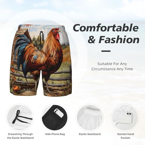 HOT ! Rooster On Wood in Farmland Print Men Stylish Functionality Swim Trunks Breathable Beach Shorts Surfing Gym Fishing
