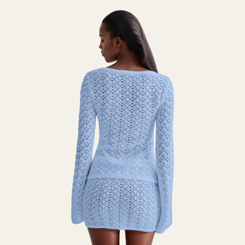 Women Crochet 2 Piece Outfits Set Swimwear Cover Up Flared Long Sleeve Button Down Tops Beach Mini Skirt Vacation Outfits 2