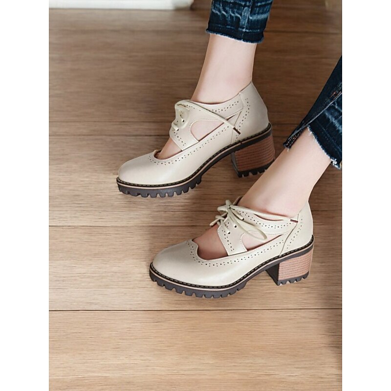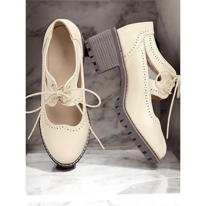 Women's Cream Lace-Up Oxford Shoes with Cut-Out Design and Chunky Sole – Vintage Casual Footwear for Everyday Wear