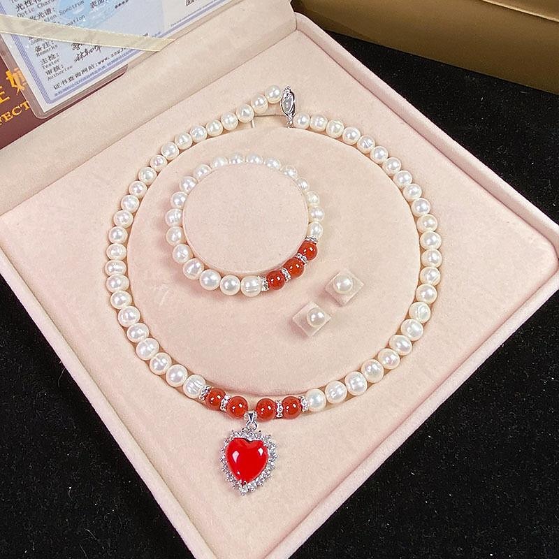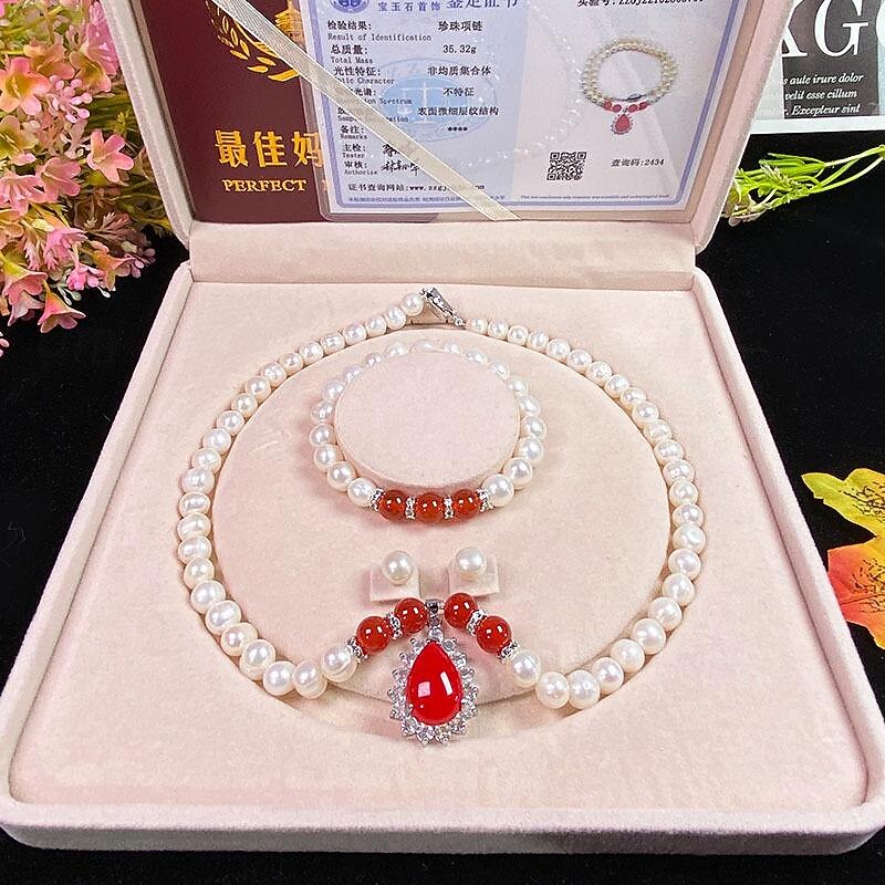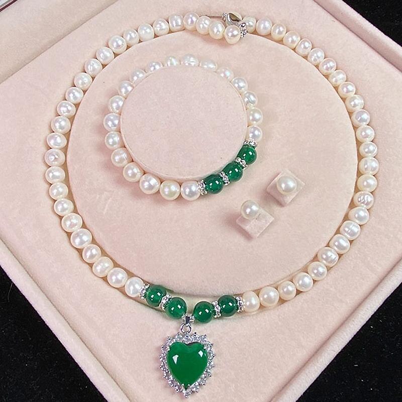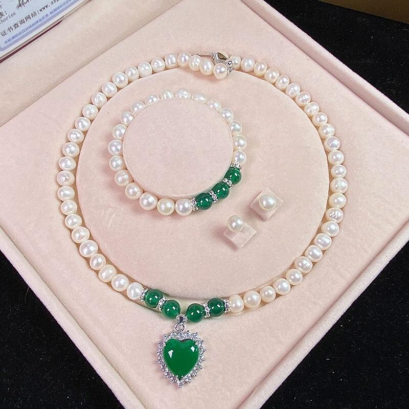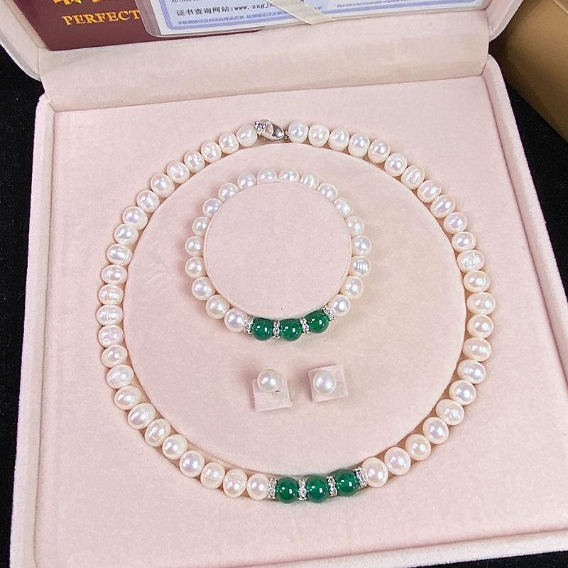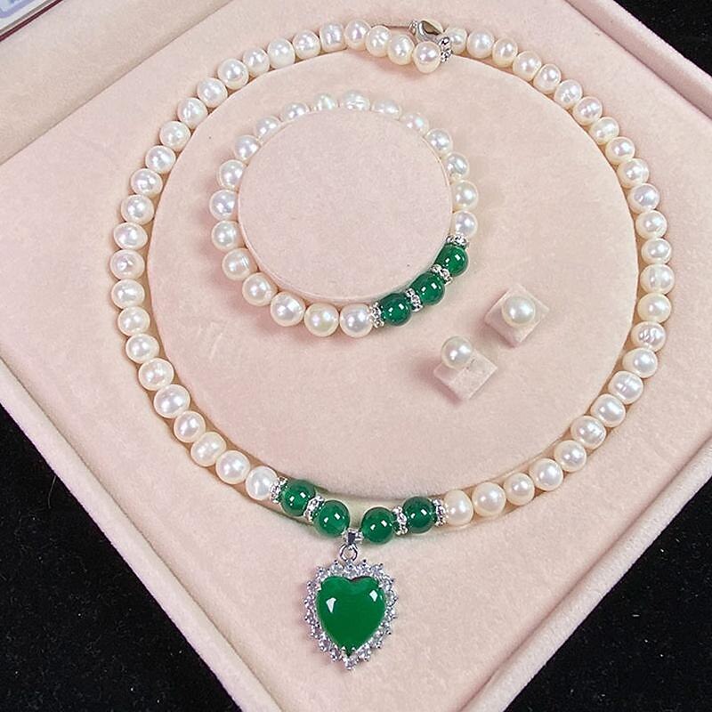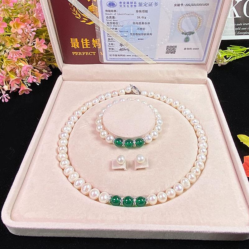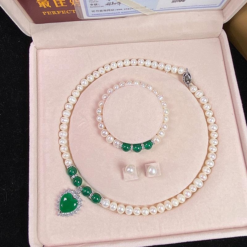 HOT ! Women's Day Gifts Natural Freshwater Pearl Necklace Green Chalcedony Pendant White Pearl Bracelet Set As A Gift For Mothers And Mother-in-law On Mother's Day Mother's Day Gifts for MoM