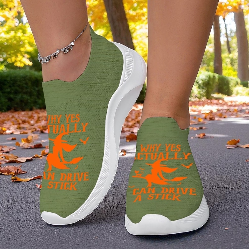 Women's Flyknit Slip-On Sneakers with Funny "Can Drive a Stick" Witch Print – Halloween Comfort Walking Shoes for Parties and Daily Outfits 12