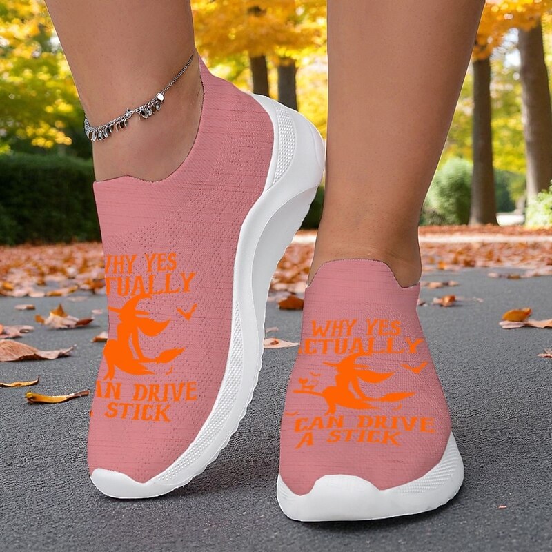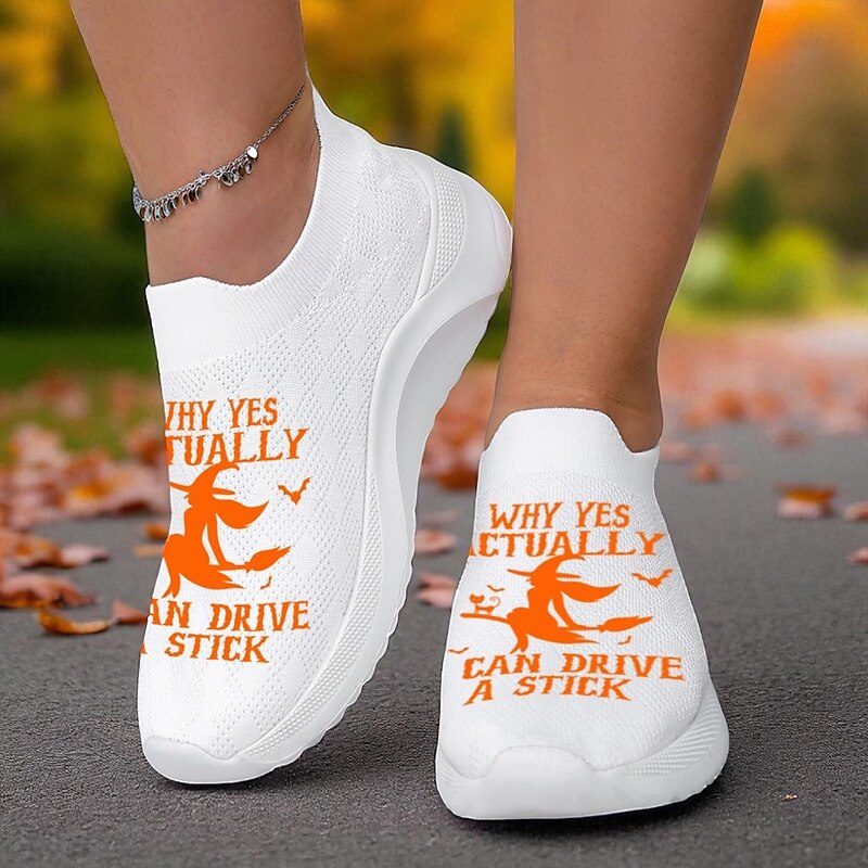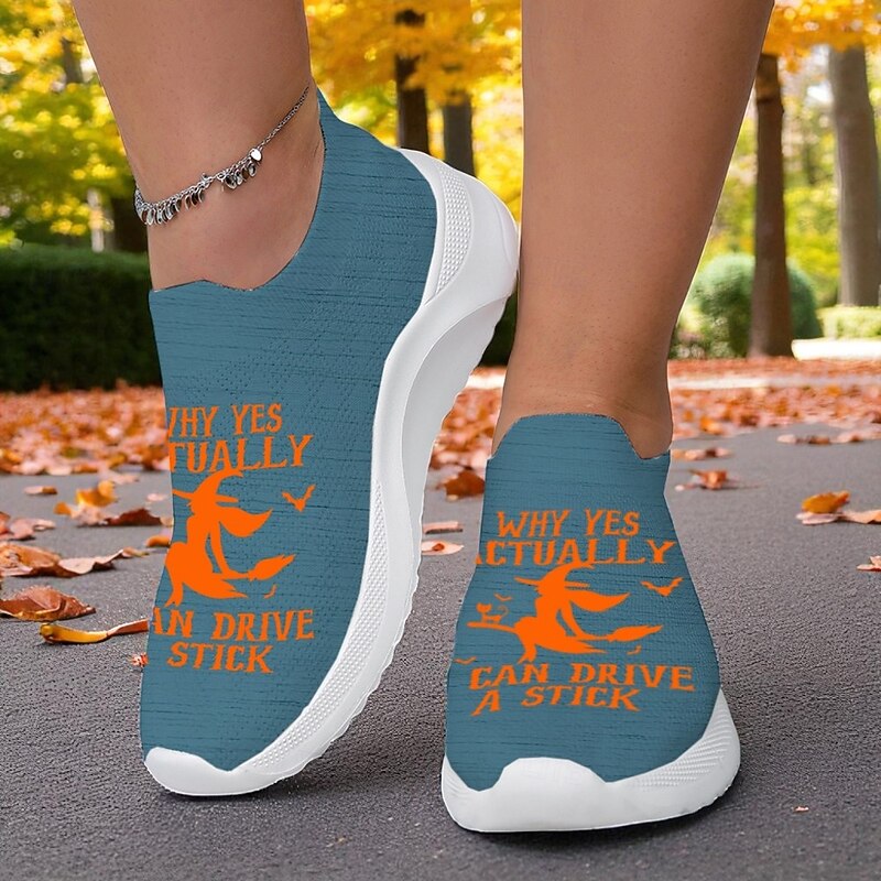 HOT ! Women's Flyknit Slip-On Sneakers with Funny "Can Drive a Stick" Witch Print – Halloween Comfort Walking Shoes for Parties and Daily Outfits