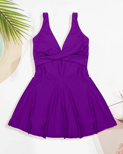 Women One Piece Swimdress Swimsuits Tummy Control V Neck A Line Skirt Crossover Modest Bathing Suits
