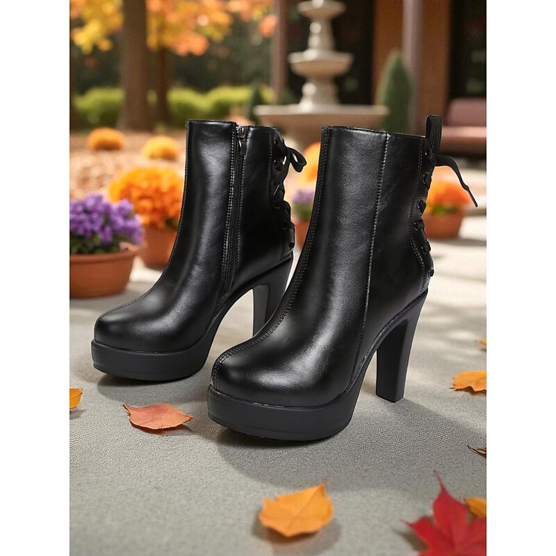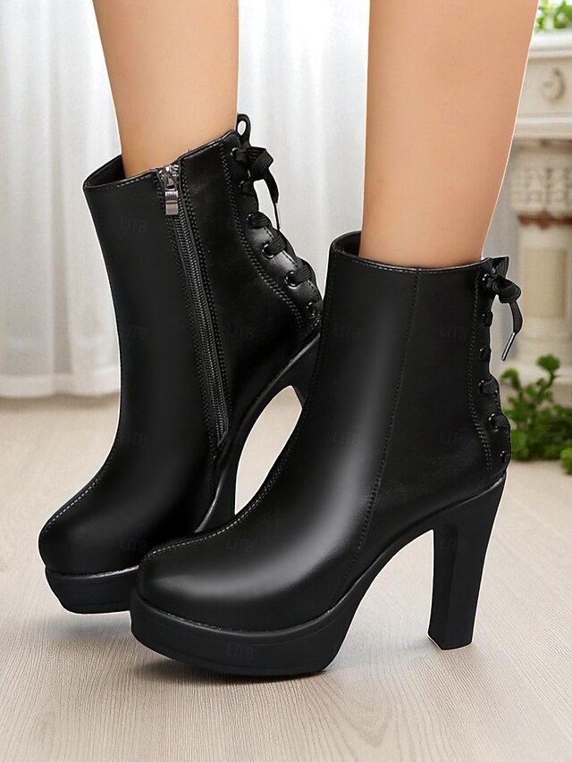 Women's Black Faux Leather Platform Ankle Boots – High Heel Side Zip Lace-Up Back Dress Booties for Party, Night Out and Fall Fashion 1