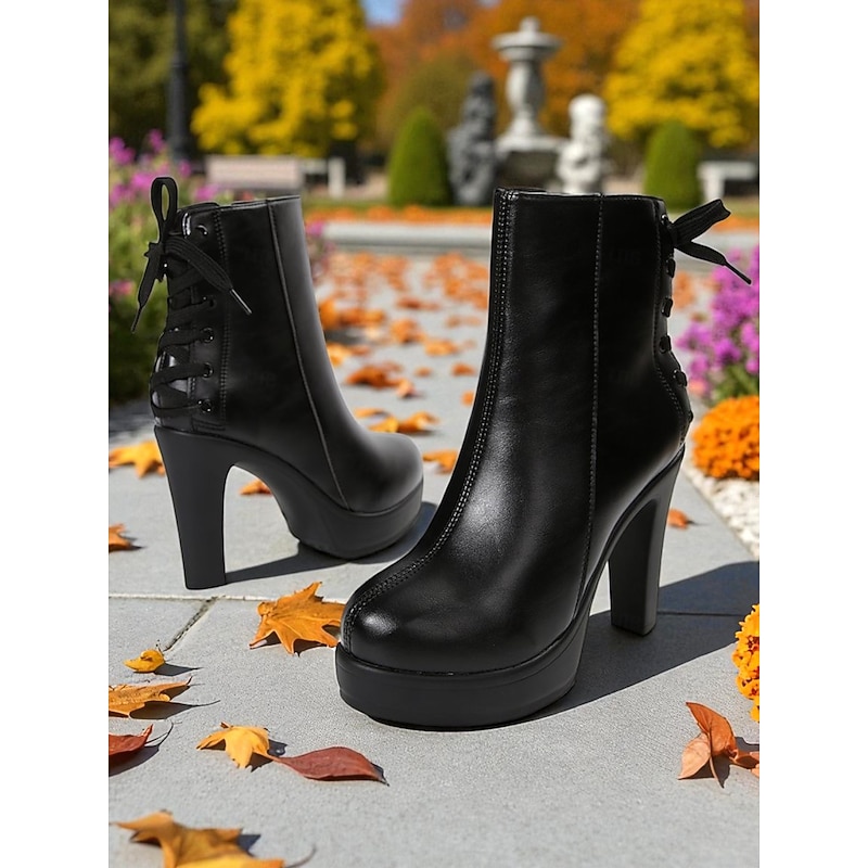 Women's Black Faux Leather Platform Ankle Boots – High Heel Side Zip Lace-Up Back Dress Booties for Party, Night Out and Fall Fashion 11