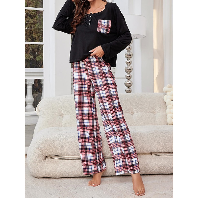 Women's Pajamas Sets Grid / Plaid Casual Comfort Home Bed Breathable Crew Neck Long Sleeve T shirt Tee Pant Button Pocket Fall Winter Home Outfits
