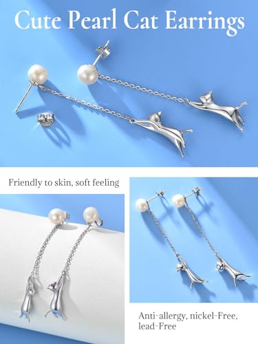• Freshwater pearl stud and 925 solid sterling silver dangling cat earrings.