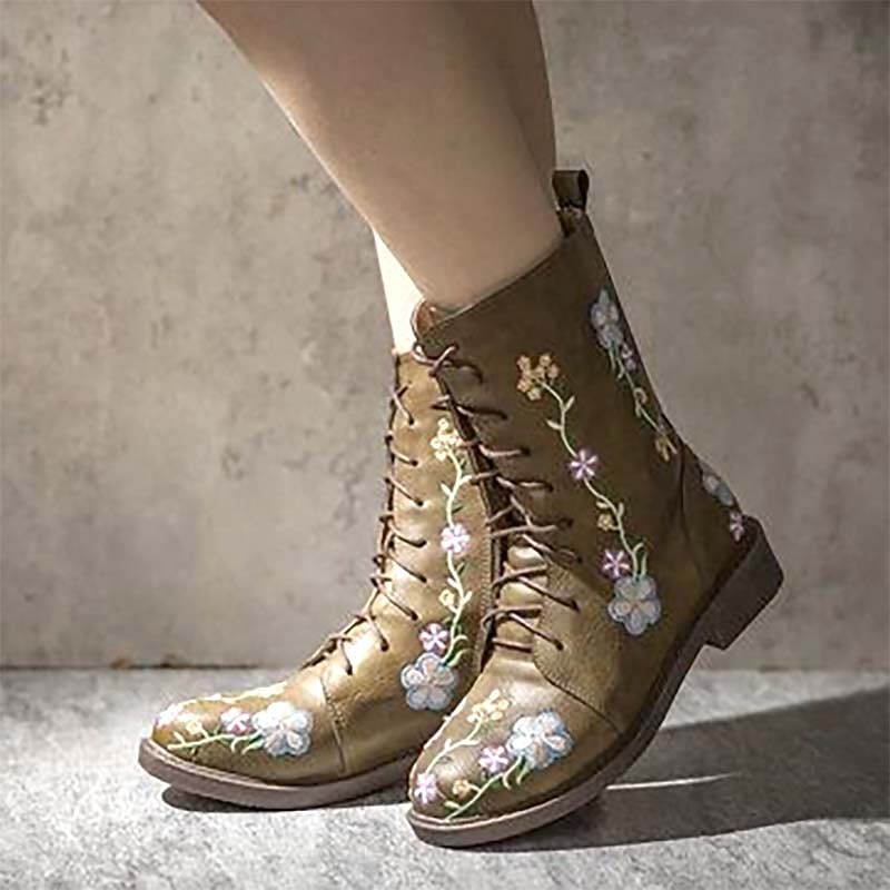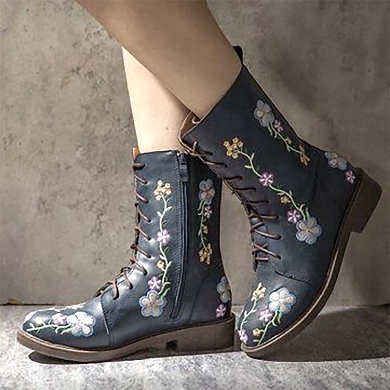 Women's Vintage Floral Embroidered Lace-Up Ankle Boots - Bohemian Style Leather Boots with Side Zipper for Fall and Winter 1