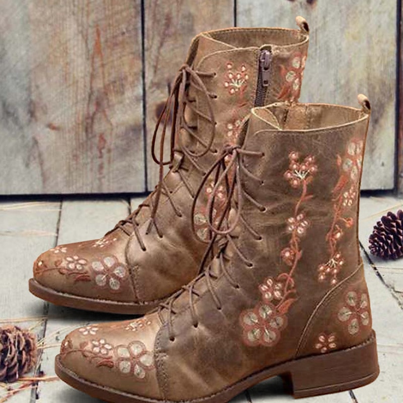 HOT ! Women's Vintage Floral Embroidered Lace-Up Ankle Boots - Bohemian Style Leather Boots with Side Zipper for Fall and Winter