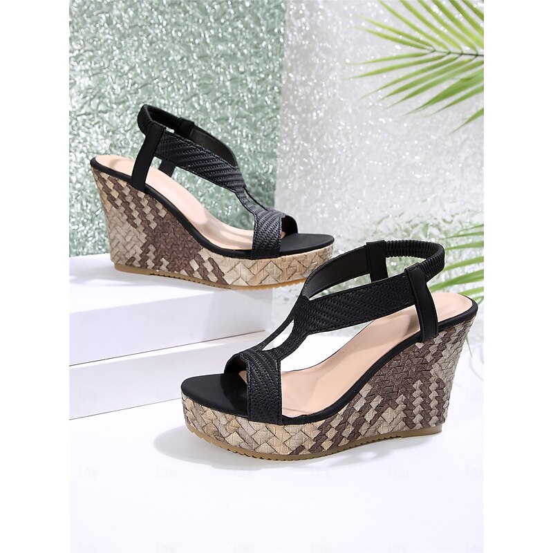 Women's Black T-Strap Wedge Sandals with Textured Pattern and Open-Toe Design, Stylish Summer Shoes for Casual and Beach Wear 20