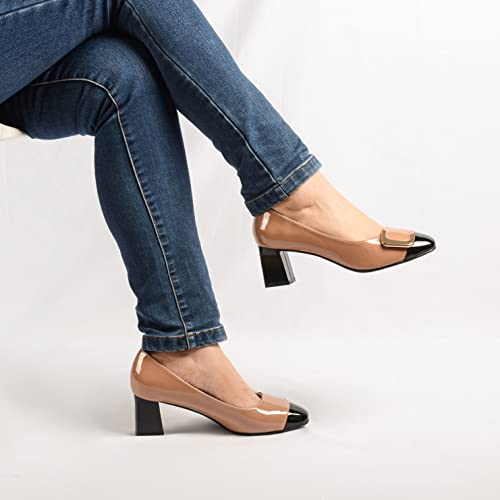 ANN CREEK Women Pumps Shoes Chunky Heels Closed Toe Pumps Short Heels Work Dressy Low Heel Pump Square Toe Two Tone 2 Inch Block Heels Cute Patent Leather Angela Nude - 7.5 6