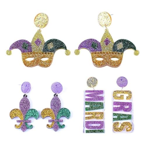 HOT ! Mardi Gras Earrings,Colorful Acrylic Carnival Cosplay Party Earring,Funny Mardi GRAS Dangle Earrings for Women Girls Holiday Jewelry Gifts