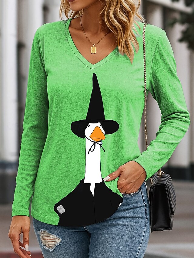 HOT ! Halloween Women's T Shirt V Neck Long Sleeve Tunic Graphic Halloween Duck Elegant Vintage Stylish Regular Tops Daily Going out Weekend Print Blue Purple Green Khaki Spring Fall