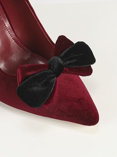 Women's Burgundy Velvet Pointed Toe High Heel Pumps, Black Bow Decoration, Elegant Evening Shoes, Chic Party Footwear, Trendy Formal High Heels 5