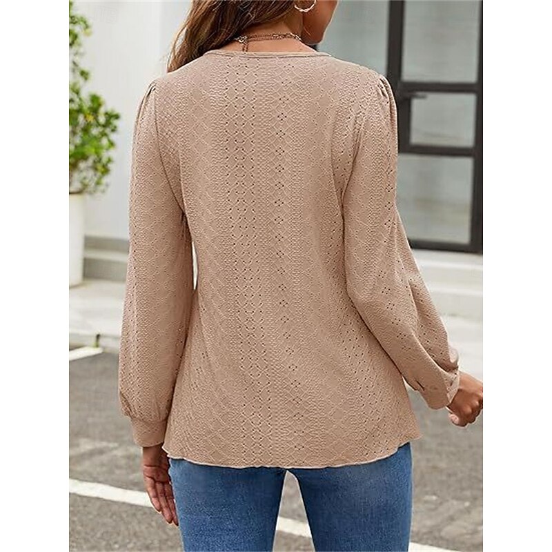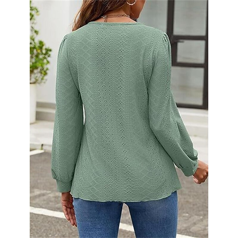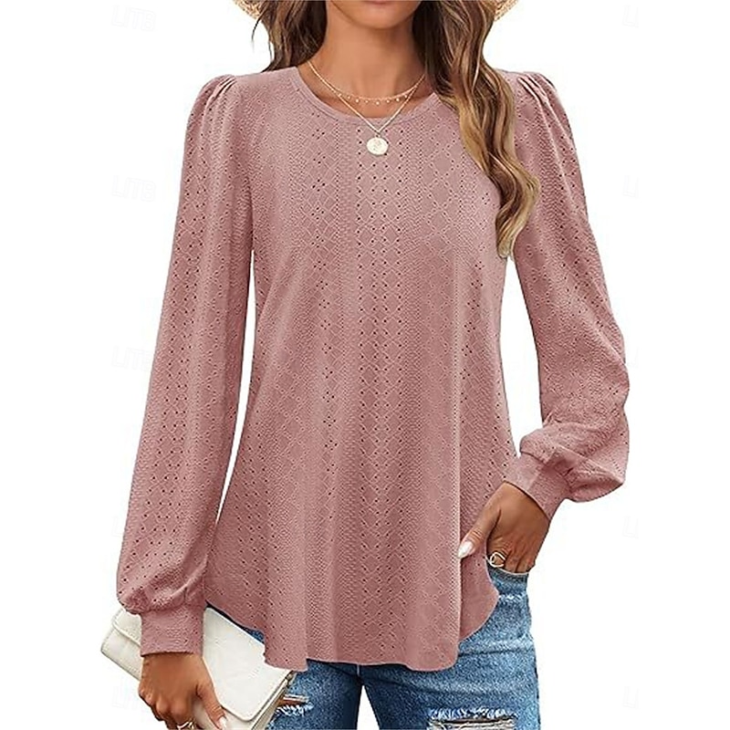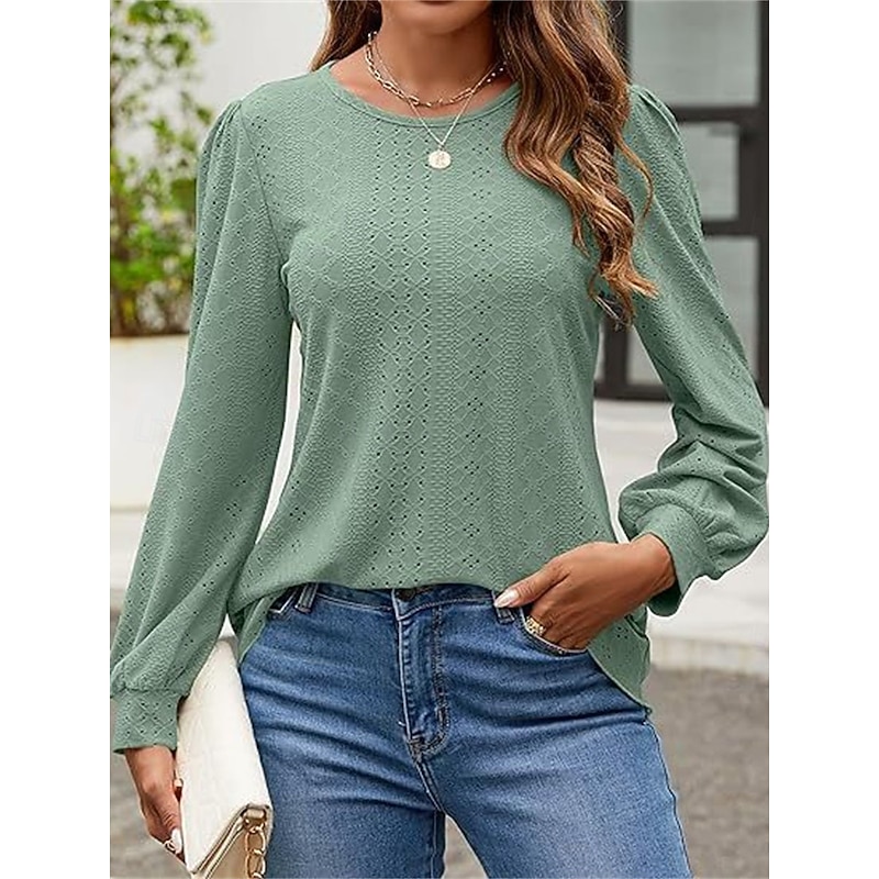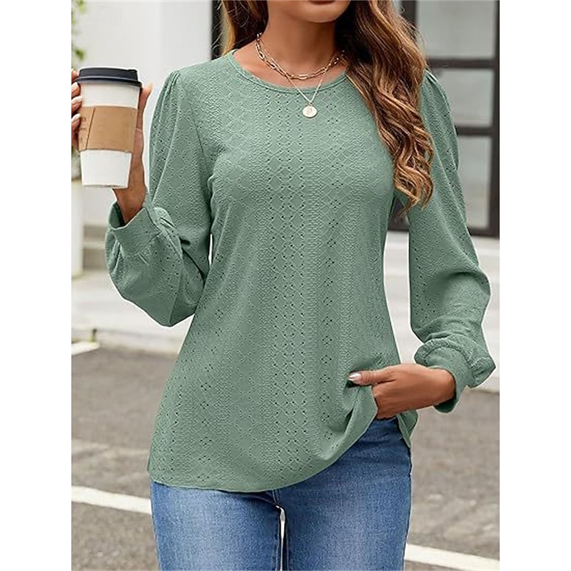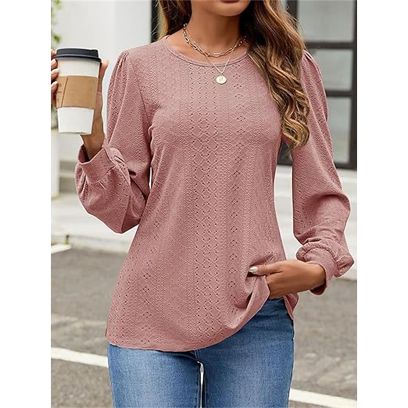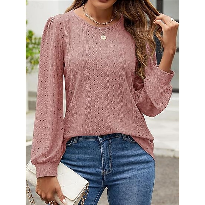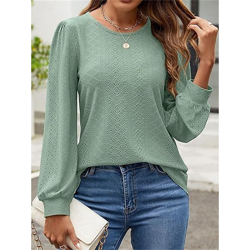 HOT ! Women's Shirt Blouse Solid Color Basic Casual Long Sleeve Crew Neck Regular Tops Daily Eyelet Pink Green Khaki Fall Winter
