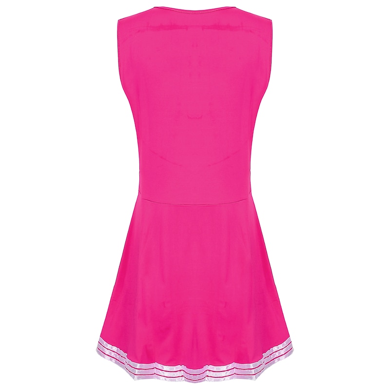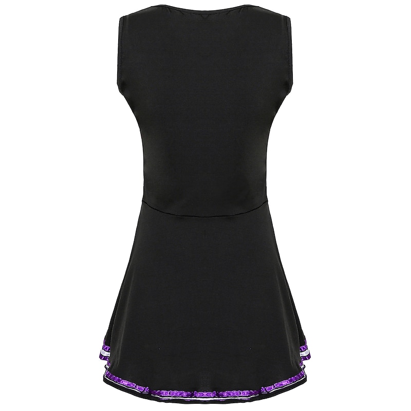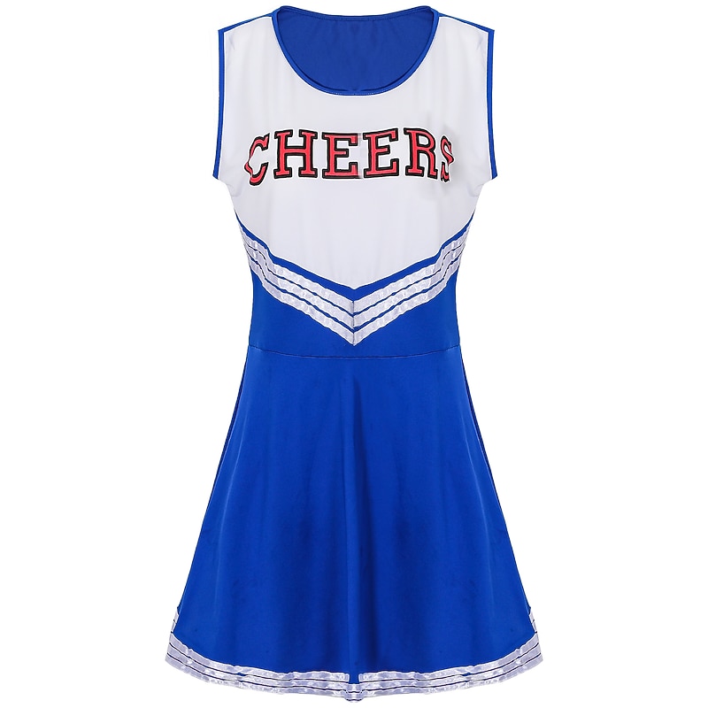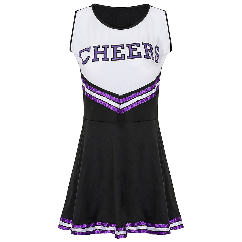: This lively outfit showcases a classic sleeveless design with a round neckline for a polished look. The standout "CHEERS" lettering across the chest adds a spirited touch, and the bold chevron detailing highlights the waist and bust. Metallic stripes embellish the hemline, infusing the costume with a shimmer and sense of excitement.