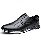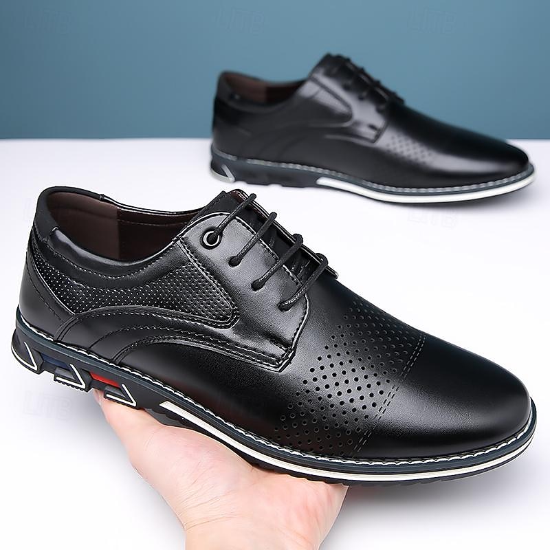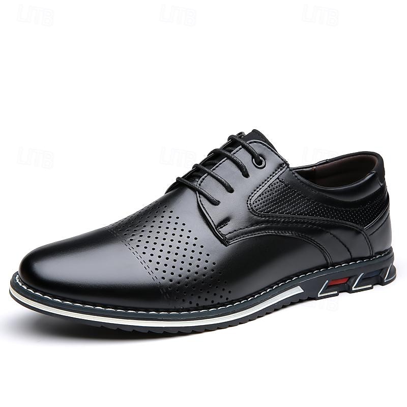 Highlights [Fabric/Materials] : Crafted from premium PU leather, these men's Oxford dress shoes offer a smooth and polished appearance. The material ensures durability and an elegant finish while featuring breathable perforations for enhanced comfort. [Fit/Shape] : Featuring a classic lace-up design, these shoes sport a refined silhouette with a round toe. The sleek shape provides a perfect blend of sophistication and comfort, making them versatile for various dress codes. [Design Highlights] : Elegant perforated detailing adorns the upper part of the shoe, adding charm and breathability. The reinforced stitching enhances durability and contributes to the modern aesthetic, while a sturdy rubber outsole ensures excellent traction. [Occasions] : Ideal for business meetings, formal events, and even casual gatherings, these shoes effortlessly blend style with practicality. Whether attending a party or heading to the office, they make a versatile addition to any wardrobe. [Size Range] : Available in sizes ranging from US 7 to US 15, these shoes cater to a wide array of foot sizes, ensuring a comfortable fit for all day wear.