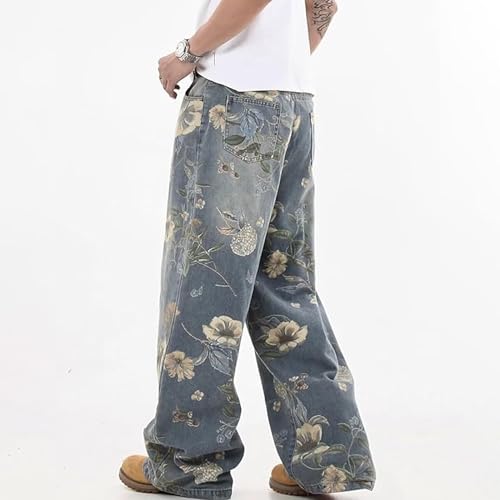 HOT ! Y2K Baggy Jeans Mens Flower Print Graphic Jeans Wide Leg Grunge Jnco Pants Vintage Floral Harajuku Denim Pants