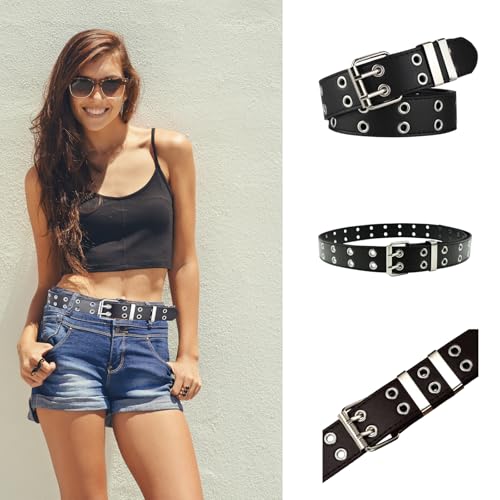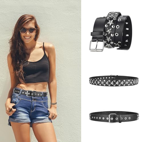 HOT ! Black Studded Belt, Star Belt Goth Y2K Double Grommet Belts Emo Gothic Rivet Punk Rock Accessories for Women Men