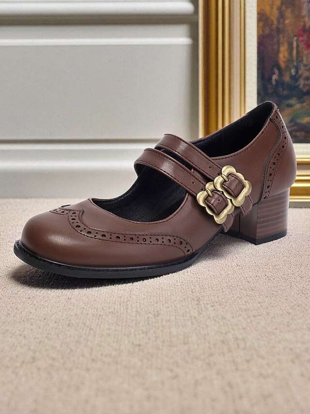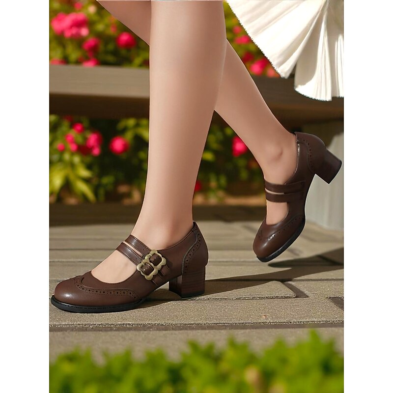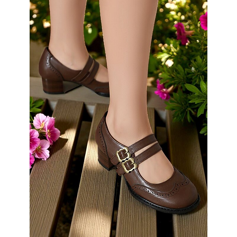 Women's Brown Faux Leather Mary Jane Pumps –1950s  Vintage Double Strap Buckle Low Heel Shoes for Daily Wear or Office Outfits 1