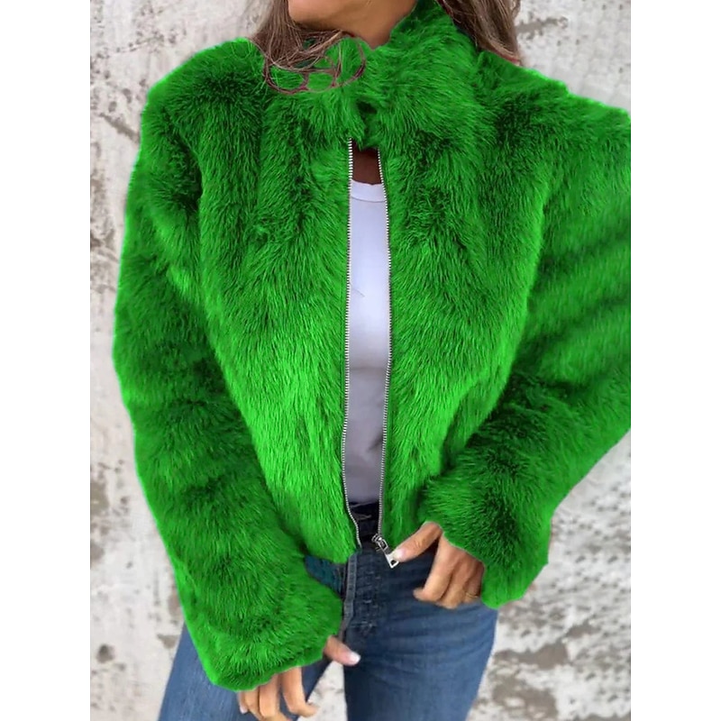 More information about Women's Faux Fur Coat Warm Breathable Zipper Casual Plain Vacation Street Daily Wear Going out Zipper Short Stand Collar Regular Fit Long Sleeve Outerwear Red Brown Green Fall Winter