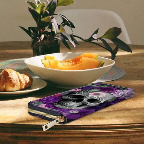Women's Wallets,Credit Card Holder Money Leather Long Wallet with Wristlet,Large Capacity with Zip-Around Phone Purse for Women Ladies Girls,Purple Skull 1