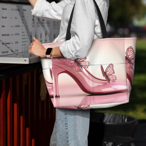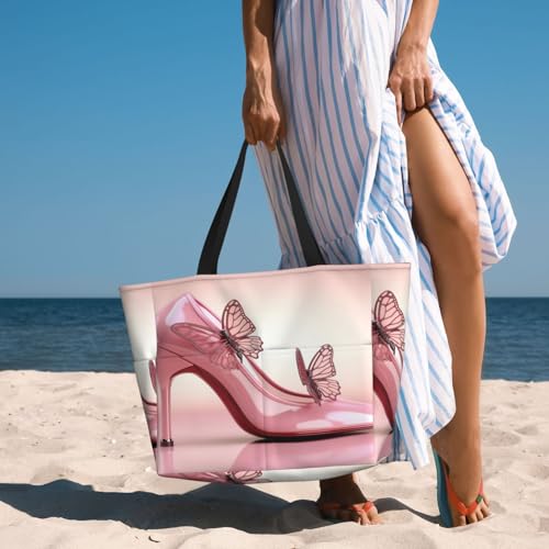 HOT ! Pink High Heels Beach Bags For Women, Butterfly Shoes Large Waterproof Tote Bag Sandproof Pool Bag Handbag For Travel Work Gym