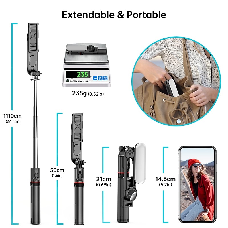 - Extendable & Foldable: This premium tripod for cell phones has a compact design, with a folded size of only 8.26 inches and a weight of 235g. This makes it portable and convenient to carry without taking up much space. The adjustable height of the cell phone tripod ranges from 8.26 to 43.7 inches, allowing you to capture shots at various heights that other phone tripod mounts cannot achieve. It offers a wider field of view and satisfies your needs for different occasions.