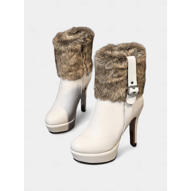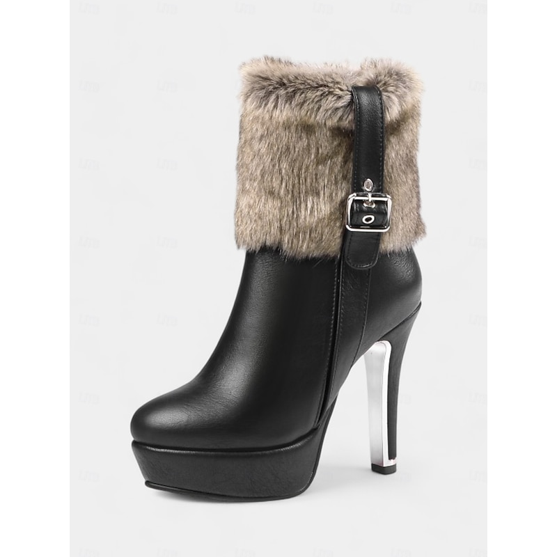 Highlights [Fabric] These festive winter holiday boots are crafted with premium PU leather combined with plush faux fur accents. The glossy exterior provides a polished and sophisticated appearance, while the faux fur trim adds both warmth and a touch of luxury. [Design] Featuring a platform heel design, these boots embody both style and practicality. The high stiletto heel is complemented by a metallic reflective finish, offering a contemporary flair to the classic profile. An adjustable buckle strap along with a convenient side zipper ensures a secure and comfortable fit. [Design Highlights] The boots are adorned with a chic faux fur trim in a natural brown tone, accentuated by an eye-catching metallic buckle detail. The combination of the sleek leather exterior and plush fur elements creates a visually striking contrast, making these boots a standout accessory in your winter wardrobe. [Occasions] Perfect for parties, festive gatherings, and holiday events, these boots effortlessly blend glamour and functionality. The stylish design and supportive platform make them an ideal choice for both day and night outings, offering a sophisticated look for various occasions. [Size Notice] Available in a range of sizes to ensure the perfect fit. The boots are offered in sizes US5.5 to US10.5, accommodating different preferences and providing comfort across various foot shapes. It is recommended to select your usual size for the best fit.