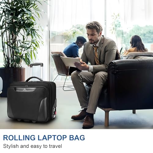 • Large Wheels & straightforward To Carry: Upgraded 17.3 inch rolling laptop bag features 5.12 inch high-density silent rubber rollers that are larger, sturdier, and quieter, allowing you to effortlessly navigate through various complex roads while reducing vibrations caused by uneven surfaces. The handle of the rolling briefcase is made of lightweight and sturdy aluminum alloy material, which can extend up to 23.4 inches to accommodate users of different heights, while providing stability and practicality