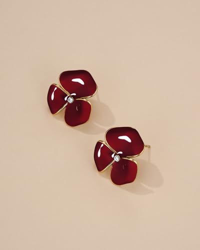 • Size and Material: These boho cute formal abstract flower stud earrings are gold plated with red burgundy maroon enamel. These gorgeous luxury earrings are waterproof, very upscale to the touch, waterproof, lightweight and easy to wear.