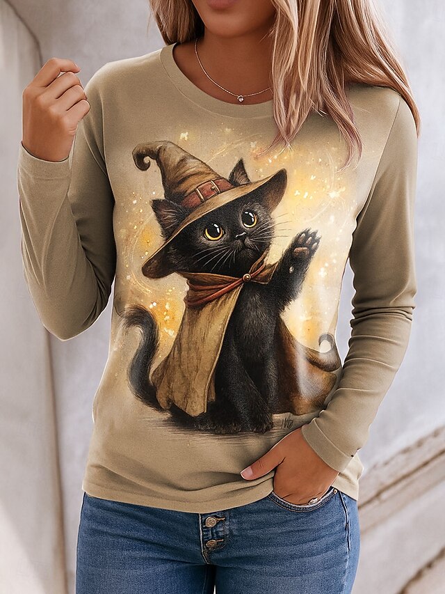 This Halloween Women's T shirt Black Cat Crew Neck Long Sleeve Tunic Graphic Cat Vintage sophisticated Classic Regular Tops Daily Print Blue Purple Green Khaki Spring Fall combines elegant design with practical functionality. Every detail has been carefully considered to ensure you get the best possible experience. The excellent construction means this product will serve you well for years to come.