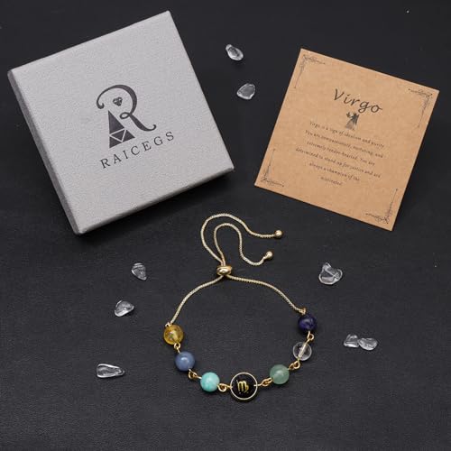 HOT ! Raicegs Zodiac Bracelets for Women 18K Gold Plated Natural Stone Zodiac Sign Bracelets Gemstone Beads Healing Crystal Bracelets Constellation Horoscope Jewelry Gifts